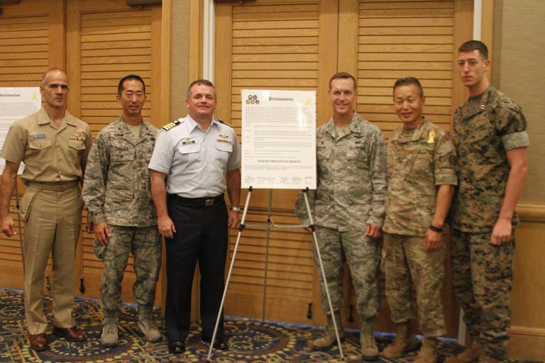 Keywords: pacific hawaii oahu army air force airforce navy marines coast guard coastguard fort shafter fortshafter hale ikeaa haleikeaa suicide prevention month suicidepreventionmonth 8th theater sustainment command 8ththeatersustainmentcommand 8th tsc 8thtsc 9th mission support command 9thmissionsupportcommand 9th msc 9thmsc joint services suicide prevention proclamation military jointservicessuicidepreventionproclamationmilitary u.s. us indoor The first Joint Suicide Prevention Proclamation was signed by representatives from all five branches of the U.S. Military September 7 at the Hale Ikena on Fort Shafter, Hawaii. September is recognized throughout the nation as Suicide Prevention Month and is designed to help raise awareness about suicide and steps to prevent it. The proclamation signing was hosted by the 9th Mission Support Command in Hawaii (Photo by Spc. Jaime Ruiz, 8th TSC Public Affairs/RELEASED) The first Joint Suicide Prevention Proclamation was signed by representatives from all five branches of the U.S. Military September 7 at the Hale Ikena on Fort Shafter, Hawaii. September is recognized throughout the nation as Suicide Prevention Month and is designed to help raise awareness about suicide and steps to prevent it. The proclamation signing was hosted by the 9th Mission Support Command in Hawaii (Photo by Spc. Jaime Ruiz, 8th TSC Public Affairs/RELEASED) |