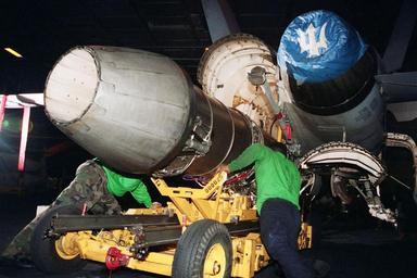 Keywords: 011220-N-3896H-004 F-110 jet engine.jpg en 011220-N-3896H-004 At sea aboard USS Theodore Roosevelt CVN 71 Dec 20 2001 -- Aviation Machinist sMate 1st Class Eddie Quarles from Detroit Mi and Aviation Machinist s Mate 3rd Class Juan Martinez from the Dominican Republic work together aboard USS Theodore Roosevelt to place an F-110 jet engine into an F/A-18 Hornet The Roosevelt in deployed in support of Operation Enduring Freedom U S Navy Photo by Photographer s Mate 2nd Class Jeremy Hall RELEASED NOTE This is the Navy's caption but it's wrong in at least 1 respect see discussion page 011220-N-3896H-004 Navy http //www navy mil/view_image asp id 282 U S Navy Photo by Photographer s Mate 2nd Class Jeremy Hall PD-USGov-Military-Navy USS Theodore Roosevelt CVN-71 hangar deck Aviation Machinist's Mate Maintenance of military aircraft |