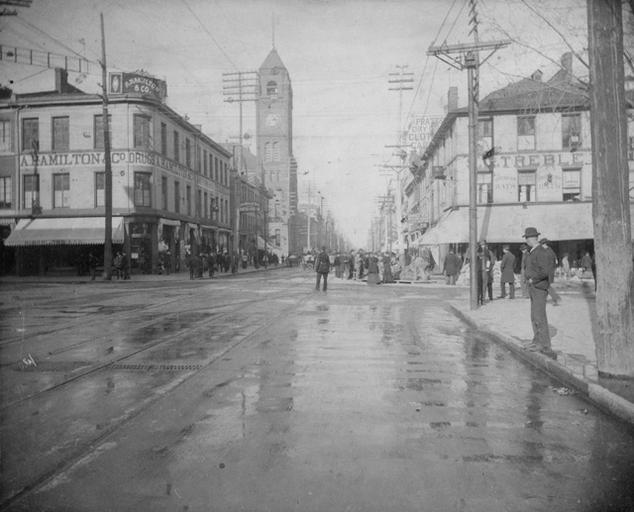 Keywords: hamilton hamont james street north jamesstreetnorth blackandwhite monochrome road black and white Looking north on James Street North from King Street, circa 1900. City Hall visible on the left. Looking north on James Street North from King Street, circa 1900. City Hall visible on the left. |