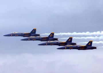 Keywords: blue angels blueangels demostration team demostrationteam manuvering hornet f/a-18 fa18 strike fighter strikefighter aircraft formation nawlins air show airshow perform fly by flyby new orleans neworleans la u.s.a. usa airplane vehicle jet outdoor airplane wing airliner 021027-N-8253M-018: Naval Air Station, Joint Reserve Base New Orleans, La. (Oct. 27, 2003) -- F/A-18 Hornets assigned to the Blue Angels perform at the 2002 N'Awlins Air Show Oct. 26 and 27 aboard Naval Air Station, Joint Reserve Base New Orleans. The U.S. NavyÕs Blue Angels entertain the audience with a tight formation fly-by. U.S. Navy photo by PhotographerÕs Mate 2nd Class Dawn C. Morrison. 021027-N-8253M-018: Naval Air Station, Joint Reserve Base New Orleans, La. (Oct. 27, 2003) -- F/A-18 Hornets assigned to the Blue Angels perform at the 2002 N'Awlins Air Show Oct. 26 and 27 aboard Naval Air Station, Joint Reserve Base New Orleans. The U.S. NavyÕs Blue Angels entertain the audience with a tight formation fly-by. U.S. Navy photo by PhotographerÕs Mate 2nd Class Dawn C. Morrison. |