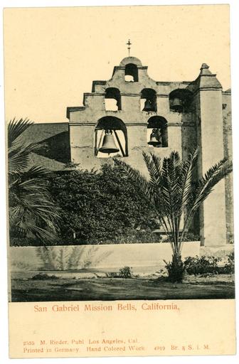 | Keywords: 04919-San Gabriel-1903-San Gabriel Mission Bells-Brück & Sohn Kunstverlag.jpg San Gabriel; San Gabriel Mission Bells Brück Sohn 04919 yes 1903 own Brück Sohn Kunstverlag Meißen cc-zero Bells in California Monasteries in the United States San Gabriel California 1903 postcards of California 1903 postcards published by Brück Sohn Postcards of San Gabriel California published by Brück Sohn Images from Brück Sohn Uploaded with VicuñaUploader | ||||