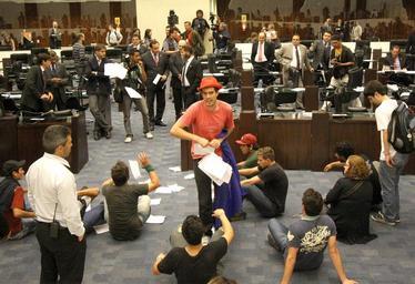 Keywords: invasão outdoor Após invasão do Plenário, durante a sessão desta segunda-feira (5/12), manifestantes rasgam as pautas de votações e demais documentos que estavam nas bancadas dos deputados. Foto: Nani Gois/Alep (crédito obrigatório) Após invasão do Plenário, durante a sessão desta segunda-feira (5/12), manifestantes rasgam as pautas de votações e demais documentos que estavam nas bancadas dos deputados. Foto: Nani Gois/Alep (crédito obrigatório) |