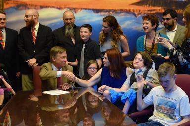 | Keywords: people Senator Chris Holbert (R - District 30) joins Rep. Singer, Gov. Hickenlooper and their guests for the signing of House Bill 1373 -- Student Medical Marijuana Use at School. Senator Chris Holbert (R - District 30) joins Rep. Singer, Gov. Hickenlooper and their guests for the signing of House Bill 1373 -- Student Medical Marijuana Use at School. |