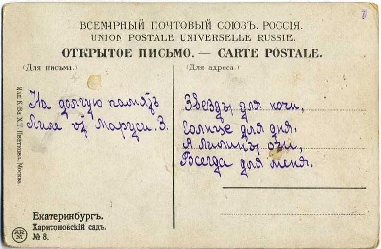 | Keywords: цветков екатеринбург yekaterinburg old postcards oldpostcards старая открытка стараяоткрытка russian empire russianempire российская империя российскаяимперия text document writing Издательство Контрагентства Х.Т. Цветкова в Москве, типография А. Рериха. Фотография Рона. ... Хрисанф Тимофеевич Цветков (ок.1877-после1926) - состоятельный и образованный мещанин, который в конце 1900-х годов имел собственную контору объявлений, позднее занимался изданием газет, разнообразных почтовых открыток и журналов, являясь с 1913 г. директором-распорядителем акционерного общества "Анонс"(Москва). Он также был контрагентом Управления КМВ по вывозу и продаже бутылок с минеральной водой в различные губернии Российской империи. ... Как видно, на открытках издания Х.Т. Цветкова(а также Г.И. Раева) начала 1910-х годов, в левом нижнем углу указан небольшой кружок в котором написано "А. Рерих Москва" или "ARM"(что означает также А.Рерих Москва). Кто же такой этот А. Рерих из Москвы. Адресные книги Москвы начала 1910-х годов указывают только одного Рериха с инициалом А.: Цитата: "Рерих Август Васильевич - адрес: М.Харитоньевский, 10, соб.дом. Места его деятельности: 1)Московская школа для бедных детей и сирот евангелического исповедания; 2)Кандидат в директоры "Товарищества Окуловской писчебумажной фабрики "В.И. Пасбург"; 3)Член Торгового Дома Л.В. Готье" Отсюда можно сделать некоторые выводы: Т.к. А. Рерих является носителем иностранного языка (немецкого) и принадлежит к лютеранско-евангелической вере, то использование иностранного логотипа «ARM» в Российской империи для него допустимо. Кроме того, А. Рерих имеет непосредственное отношение к писчебумажным фабрикам, и поэтому может быть связан с производством почтовых открыток. Таким образом, можно предположить, что обладателем логотипа "ARM" на российских открытках начала ХХ века является житель Москвы - Август Васильевич Рерих. Источник информации filokartist.net/forum/viewtopic.php?p=111961 Источник копии: Nath - 1723.ru Екатеринбурга+Свердловска. > Архитектура Екатеринбурга первой волны. 1723.ru/forums/index.php?showtopic=4265&st=420 Издательство Контрагентства Х.Т. Цветкова в Москве, типография А. Рериха. Фотография Рона. ... Хрисанф Тимофеевич Цветков (ок.1877-после1926) - состоятельный и образованный мещанин, который в конце 1900-х годов имел собственную контору объявлений, позднее занимался изданием газет, разнообразных почтовых открыток и журналов, являясь с 1913 г. директором-распорядителем акционерного общества "Анонс"(Москва). Он также был контрагентом Управления КМВ по вывозу и продаже бутылок с минеральной водой в различные губернии Российской империи. ... Как видно, на открытках издания Х.Т. Цветкова(а также Г.И. Раева) начала 1910-х годов, в левом нижнем углу указан небольшой кружок в котором написано "А. Рерих Москва" или "ARM"(что означает также А.Рерих Москва). Кто же такой этот А. Рерих из Москвы. Адресные книги Москвы начала 1910-х годов указывают только одного Рериха с инициалом А.: Цитата: "Рерих Август Васильевич - адрес: М.Харитоньевский, 10, соб.дом. Места его деятельности: 1)Московская школа для бедных детей и сирот евангелического исповедания; 2)Кандидат в директоры "Товарищества Окуловской писчебумажной фабрики "В.И. Пасбург"; 3)Член Торгового Дома Л.В. Готье" Отсюда можно сделать некоторые выводы: Т.к. А. Рерих является носителем иностранного языка (немецкого) и принадлежит к лютеранско-евангелической вере, т