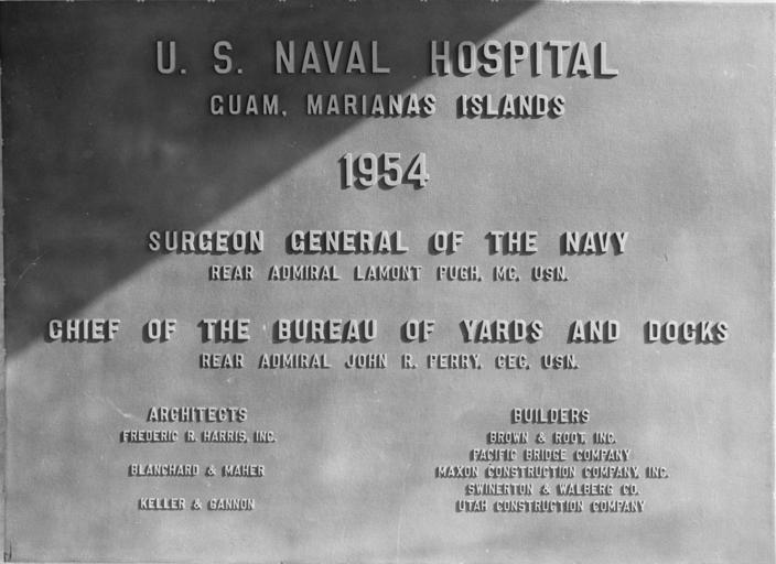 Keywords: blackandwhite text monochrome writing black and white 09-5030-60 U.S. Naval Hospital. Dedication plaque. "1954 Surgeon General of the Navy Rear Admiral Lamont Pugh, Medical Corps, U.S. Navy; Chief of the Bureau of Yards and Docks Rear Admiral John R. Perry, CEC [Civil Engineer Corps?], U.S. Navy; Architects Frederic R. Harris, Inc., Blanchard and Maher, Keller and Gannon; Builders Brown and Root, Inc., Pacific Bridge Company, Maxon Construction Company, Inc., Swinerton and Walberg Co., Utah Construction Company." [Scene.] Guam, Marianas Islands, 11/29/1954; VU-5-7794-11-54. 09-5030-60 U.S. Naval Hospital. Dedication plaque. "1954 Surgeon General of the Navy Rear Admiral Lamont Pugh, Medical Corps, U.S. Navy; Chief of the Bureau of Yards and Docks Rear Admiral John R. Perry, CEC [Civil Engineer Corps?], U.S. Navy; Architects Frederic R. Harris, Inc., Blanchard and Maher, Keller and Gannon; Builders Brown and Root, Inc., Pacific Bridge Company, Maxon Construction Company, Inc., Swinerton and Walberg Co., Utah Construction Company." [Scene.] Guam, Marianas Islands, 11/29/1954; VU-5-7794-11-54. |