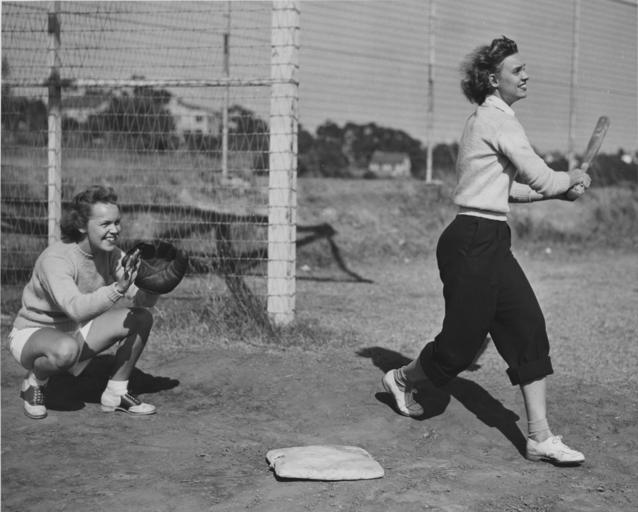 | Keywords: blackandwhite monochrome outdoor black and white 09-5055-31 How Navy Nurses Keep Fit - "Keep fit to keep fighting men fit" is the motto of nurses at the U.S. Naval Hospital, San Diego, who have inaugurated a rigorous physical training program. Voluntarily participating in sports and calisthenics, the Navy nurses are preparing themselves to withstand the war-time physical demands of long hours during emergencies and of service outside the continental limits of the United states. The sports have the additional advantage of providing off-hour recreation and keeping the nurses trim. Added zest has been given the games by competition between nurses quartered at Balboa Park and those living on the hospital compound, and between nurses and WAVES. Unused grounds on the hospital reservation have been utilized in providing recreational facilities. A hilly area in front of the administration building has been covered with grass, trees and flowers and converted into a 9 hole golf course. Dorothy Wheeler, of Lincoln, Nebraska, captain of one of the Navy Nurses softball teams, slams out a long single into left field during a game at the U.S. Naval Hospital, San Diego. Grace Nilsen, of Escanaba, Michigan is the catcher. [Exercise.][Recreation.][Nurses. Nursing.][Scene.] San Diego, California Part III. Released 06/1943;File Number: MS-RE-22-42835; 948; 09-5055-31 How Navy Nurses Keep Fit - "Keep fit to keep fighting men fit" is the motto of nurses at the U.S. Naval Hospital, San Diego, who have inaugurated a rigorous physical training program. Voluntarily participating in sports and calisthenics, the Navy nurses are preparing themselves to withstand the war-time physical demands of long hours during emergencies and of service outside the continental limits of the United states. The sports have the additional advantage of providing off-hour recreation and keeping the nurses trim. Added zest has been given the games by competition between nurses quartered at Balboa Park and those living on the hospital compound, and between nurses and WAVES. Unused grounds on the hospital reservation have been utilized in providing recreational facilities. A hilly area in front of the administration building has been covered with grass, trees and flowers and converted into a 9 hole golf course. Dorothy Wheeler, of Lincoln, Nebraska, captain of one of the Navy Nurses softball teams, slams out a long single into left field during a game at the U.S. Naval Hospital, San Diego. Grace Nilsen, of Escanaba, Michigan is the catcher. [Exercise.][Recreation.][Nurses. Nursing.][Scene.] San Diego, California Part III. Released 06/1943;File Number: MS-RE-22-42835; 948; |