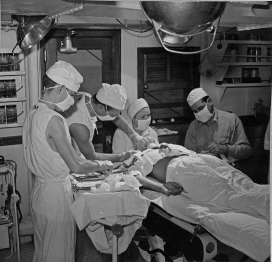 | Keywords: blackandwhite monochrome room indoor black and white 09-5072-8 Mercy on the warring seas. Dedicated to lessening the high cost of war in death and suffering. Navy hospital ships went "Up Front" with war vessels. While Lieutenant Commander L.J. Schneeberger (Medical Corps) U.S. Naval Reserve (Right) administers pentothal anesthetic, Lieutenant (junior grade) Medical Corps removes shrapnel from a casualty aboard the USS Solace, assisting in to operation are Lieutenant (junior grade) Lucille Tucker (Nurse Corps) U.S. Navy of Victoria, Texas, and Pharmacist's Mate 3rd Class R.S. Anderson. [Surgery.][Anesthesia.][Hospital ships. Transport of sick and wounded.][Scene.] Solace (AH-5) Folder 410/14/1945; 09-5072-8 Mercy on the warring seas. Dedicated to lessening the high cost of war in death and suffering. Navy hospital ships went "Up Front" with war vessels. While Lieutenant Commander L.J. Schneeberger (Medical Corps) U.S. Naval Reserve (Right) administers pentothal anesthetic, Lieutenant (junior grade) Medical Corps removes shrapnel from a casualty aboard the USS Solace, assisting in to operation are Lieutenant (junior grade) Lucille Tucker (Nurse Corps) U.S. Navy of Victoria, Texas, and Pharmacist's Mate 3rd Class R.S. Anderson. [Surgery.][Anesthesia.][Hospital ships. Transport of sick and wounded.][Scene.] Solace (AH-5) Folder 410/14/1945; |