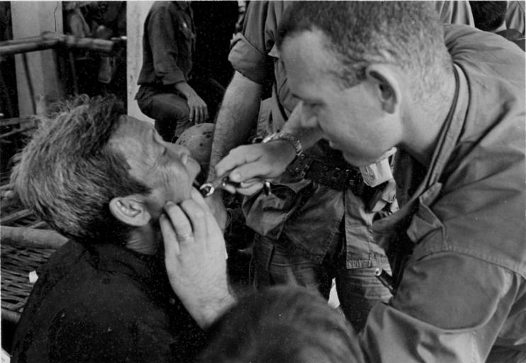 | Keywords: blackandwhite monochrome black and white 09-7971-95 Da Nang, Vietnam, 12/22 - Extraction - A tooth is removed during a medical civic action program (Medcap) at Bo Mung (2) 10 miles south of Da Nang. Dental Technician 3rd Class James Betts, 27 (1616 Edison Street, Tucson, Arizona), a dental technician attached to the 3rd Battalion, 5th Marine Regiment, treats the Vietnamese farmer. [Dentistry.] [Vietnam War.] [Scene.] Vietnam - Treating Civilians. 12/12/1967; 1st Marine Division Release 1695-67; Photo Number 1d-7-346-67; Photo by Sergeant W.F. Dickman; 09-7971-95 Da Nang, Vietnam, 12/22 - Extraction - A tooth is removed during a medical civic action program (Medcap) at Bo Mung (2) 10 miles south of Da Nang. Dental Technician 3rd Class James Betts, 27 (1616 Edison Street, Tucson, Arizona), a dental technician attached to the 3rd Battalion, 5th Marine Regiment, treats the Vietnamese farmer. [Dentistry.] [Vietnam War.] [Scene.] Vietnam - Treating Civilians. 12/12/1967; 1st Marine Division Release 1695-67; Photo Number 1d-7-346-67; Photo by Sergeant W.F. Dickman; |
