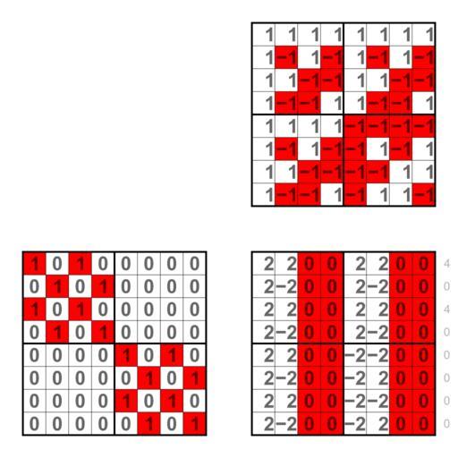 | Keywords: 1010 0000 Walsh spectrum.svg Walsh spectra of 3-ary Boolean functions like 0111 0000 The binary strings are multiplied with a Walsh matrix of order 8 The red squares in the background are additional information and show the product of the binary strings with a binary Walsh matrix own Lipedia Walsh spectrum of 3-ary Boolean functions |