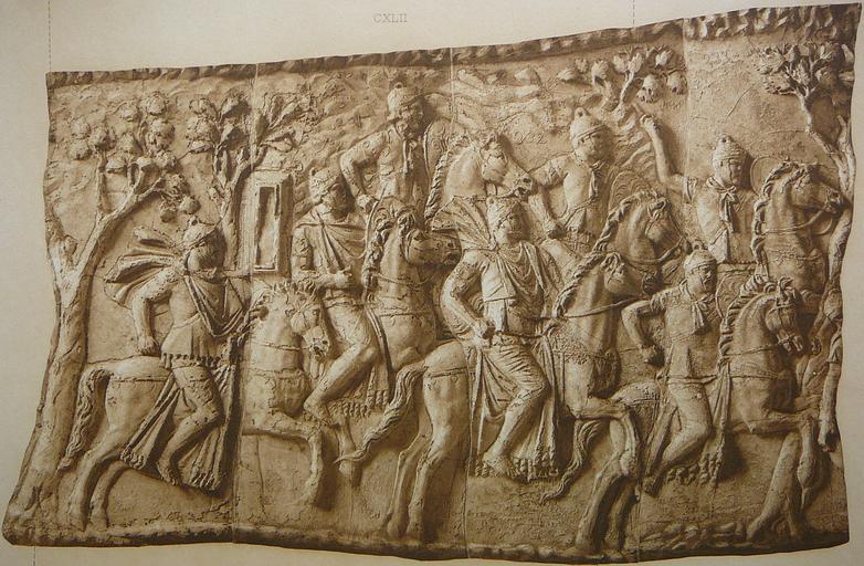 Keywords: 104 Conrad Cichorius, Die Reliefs der Traianssäule, Tafel CIV.jpg attributed to Graphics Die Reliefs der Traianssäule nach Conrad Cichorius Tafel CIV Römische Kavallerie im Gebirge Szene CXLII ; Verfolgungsgefecht Szene CXLIII The Reliefs of Trajan's Column by Conrad Cichorius Plate number CIV Roman cavalry in the mountains Scene CXLII ; Fight between pursuers and pursued Scene CXLIII Sculpture AD 113 ; Graphics 1900 Sculpture bas-relief; Graphics monochrome graphics based on photographs Sculpture Institution Trajan's Column object history credit line accession number Conrad Cichorius Die Reliefs der Traianssäule Zweiter Tafelband Die Reliefs des Zweiten Dakischen Krieges Tafeln 58-113 Verlag von Georg Reimer Berlin 1900 other versions 1932 Trajan's Column - Cichorius Plates Roman cavalry |