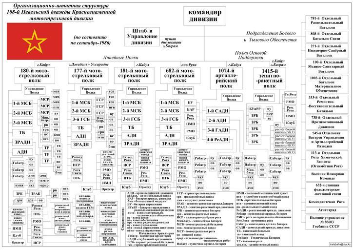 | Keywords: ОШС 108-й мотострелковой дивизии.jpg BadJPEG ru О ганизационно-Штатная Ст укту а 108-й евельской дважды К аснознаменной отост елковой Дивизии По состоянию на сентяб ь-1986 Схема составлена по мате иалам Бешка ёва Александ а Ивановича ПЕРЕЧЕ Ь СОВЕТСКИХ ВОИ СКИХ ЧАСТЕЙ В АФГА ИСТА Е 1979-1989 гг и по мате иалам из сайта 108-й мсд Отче чено в AutoCAD 2005 собственно учно Источник данных - http //www soldat ru/force/sssr/afganistan/perechen html http //108msd ru/ Own Kalabaha1969 2011-05-30 Cc-zero Order of the Red Banner USSR Soviet Afghan War Military units and formations of the Soviet Union |