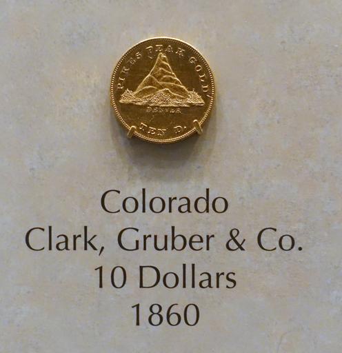 Keywords: 10 Dollars, Clark, Gruber & Co., Colorado, 1860 - National Museum of American History - DSC00222.jpg en Exhibit in the National Museum of American History Washington DC USA Photography was permitted in the museum without restriction 2015-03-27 11 32 20 own Daderot other versions cc-zero Coins of the Pike's Peak Gold Rush in the National Museum of American History |