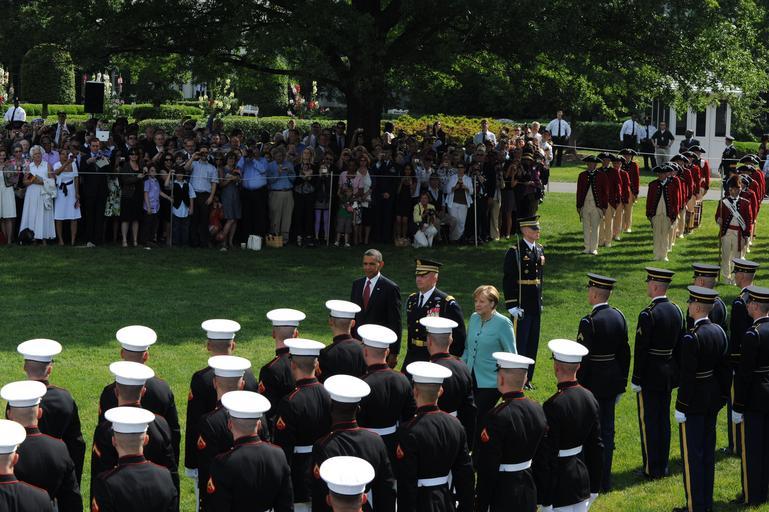 | Keywords: white house whitehouse president chancellor obama merkel germany ceremonial navy band navyband navy ceremonial band navyceremonialband people crowd sport outdoor 110607-N-HG258-125 WASHINGTON, D.C. (June 7, 2011) Capt. Brian Walden conducts the U.S. Navy Ceremonial Band as President Barack Obama and Chancellor Angela Merkel inspect the troops during the arrival ceremony welcoming the chancellor of the Federal Republic of Germany, Angela Merkel. Military arrival ceremonies for visiting dignitaries have been held on the south lawn of the White House since the Kennedy administration. (U.S. Navy Photo by MUC Stephen Hassay/Released) 110607-N-HG258-125 WASHINGTON, D.C. (June 7, 2011) Capt. Brian Walden conducts the U.S. Navy Ceremonial Band as President Barack Obama and Chancellor Angela Merkel inspect the troops during the arrival ceremony welcoming the chancellor of the Federal Republic of Germany, Angela Merkel. Military arrival ceremonies for visiting dignitaries have been held on the south lawn of the White House since the Kennedy administration. (U.S. Navy Photo by MUC Stephen Hassay/Released) |
