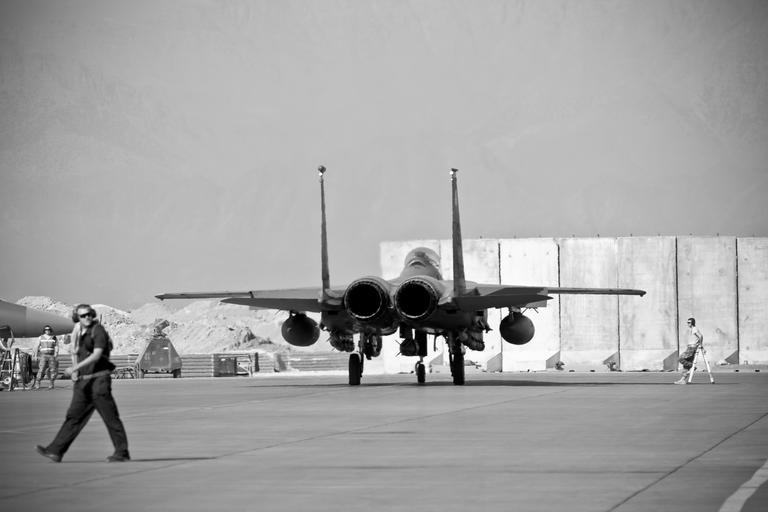 | Keywords: u.s. air force usairforce u.s. army usarmy rc east rceast rce oef operation enduring freedom operationenduringfreedom afghanistan bagram baf usaf air force airforce cas close air support closeairsupport military photo f-15e f15e strike eagle strikeeagle airman airmen maintenance army 335th fighter squadron fightersquadron 335th fighter squadron 335thfightersquadron strike eagle fighter squadron operation enduring freedom f-15 f15 afterburner take off airplane aircraft combat close air support aviation conflict pilot pilots weapons bombs creative commons royalty free public domain photograph digital matt hecht getty reuters ap blackandwhite monochrome black and white U.S. Air Force Airmen from Bagram Air Field, Afghanistan, perform maintenance on F-15E Strike Eagles on Sept 30, 2011. Strike Eagles are all-weather multirole fighters that provide close aire support for coalition troops. (U.S. Air National Guard photo by Tech. Sgt. Matt Hecht/Released) U.S. Air Force Airmen from Bagram Air Field, Afghanistan, perform maintenance on F-15E Strike Eagles on Sept 30, 2011. Strike Eagles are all-weather multirole fighters that provide close aire support for coalition troops. (U.S. Air National Guard photo by Tech. Sgt. Matt Hecht/Released) |