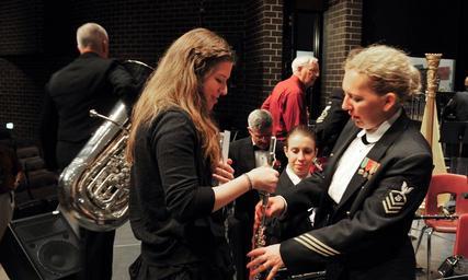 Keywords: cedar rapids cedarrapids iowa usa people 120324-N-AB816-003 CEDAR RAPIDS, IOWA (March 24, 2012) Chief Musician Christina Bayes, flutist with the United States Navy Band, meets with a Kennedy High School flute player who performed “Washington Post” by John Philip Sousa with the United States Navy Band. The Navy Band frequently invites local high school student musicians to perform the Sousa standard with the Band while on tour. The concert, performed at Kennedy High School in Cedar Rapids, was conducted by enlisted conductor Senior Chief Musician Mike Schmitz. This was the nineteenth day of the band's 26 day National Spring Tour of the Midwest. (U.S. Navy photo by MU1 Shana E. Catandella/Released) 120324-N-AB816-003 CEDAR RAPIDS, IOWA (March 24, 2012) Chief Musician Christina Bayes, flutist with the United States Navy Band, meets with a Kennedy High School flute player who performed “Washington Post” by John Philip Sousa with the United States Navy Band. The Navy Band frequently invites local high school student musicians to perform the Sousa standard with the Band while on tour. The concert, performed at Kennedy High School in Cedar Rapids, was conducted by enlisted conductor Senior Chief Musician Mike Schmitz. This was the nineteenth day of the band's 26 day National Spring Tour of the Midwest. (U.S. Navy photo by MU1 Shana E. Catandella/Released) |