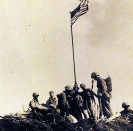 | Keywords: outdoor 127-GW-319-A708068: Iwo Jima Operations, Feb-March 1945. U.S. Marines of First Lieutenant Harold G. Schrier’s patrol, Co. “E”, 2nd bn, 28th Marines, moments after raising the First Flag atop Mt. Suribachi. Identifiable U.S. Marines are: Private First Class Gene M. Marshall, carrying radio and Sergeant Henry O. Hansen, immediately to the left of Private First Class, Marshall, wearing utility cover, with right hand on flag pole. Photographed by Sergeant L.R. Lowery, February 23, 1945. U.S. Marine Corps Photograph, now in the collections of the National Archives. (2016/09/06). 127-GW-319-A708068: Iwo Jima Operations, Feb-March 1945. U.S. Marines of First Lieutenant Harold G. Schrier’s patrol, Co. “E”, 2nd bn, 28th Marines, moments after raising the First Flag atop Mt. Suribachi. Identifiable U.S. Marines are: Private First Class Gene M. Marshall, carrying radio and Sergeant Henry O. Hansen, immediately to the left of Private First Class, Marshall, wearing utility cover, with right hand on flag pole. Photographed by Sergeant L.R. Lowery, February 23, 1945. U.S. Marine Corps Photograph, now in the collections of the National Archives. (2016/09/06). |