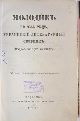 Keywords: Молодик часопис 1280.jpg олодик часопис Ха ьків 1843 Титульний а куш З особистої бібліотеки І Ф анка Molodyk periodical Kharkiv 1843 From Ivan Franko personal Library 1843 Institution Shevchenko Institute of Literature Digital Collection PD-old-70-1923 Books published in Kharkiv Franko Personal Library Collections of books in libraries in Ukraine Shevchenko Institute of Literature Uploaded with VicuñaUploader