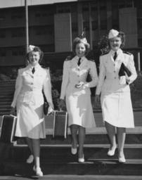 | Keywords: people groupshot blackandwhite monochrome black and white U.S. Naval Hospital, Aiea Heights, Oahu, Territory of Hawaii - The Carey Sisters of Mercy have arrived to care for the marines and sailors wounded in the Pacific battle area. The Boulder, Mont., young women are shown in front of the nurses' quarters at the large naval hospital, which overlooks Pearl Harbor. The sisters are graduates of St. James Hospital, Butte, Mont. and entered the service August 1943, and had naval hospital duties at Mare Island and Corona, Cal., before coming overseas. Left to right: LTJG Agnes Carey NC USNR, LTJG Josephine Carey NC USNR, and LTJG Lillian Carey NC, USNR. [World War 2]. 12-0169-002 U.S. Naval Hospital, Aiea Heights, Oahu, Territory of Hawaii - The Carey Sisters of Mercy have arrived to care for the marines and sailors wounded in the Pacific battle area. The Boulder, Mont., young women are shown in front of the nurses' quarters at the large naval hospital, which overlooks Pearl Harbor. The sisters are graduates of St. James Hospital, Butte, Mont. and entered the service August 1943, and had naval hospital duties at Mare Island and Corona, Cal., before coming overseas. Left to right: LTJG Agnes Carey NC USNR, LTJG Josephine Carey NC USNR, and LTJG Lillian Carey NC, USNR. [World War 2]. 12-0169-002 |