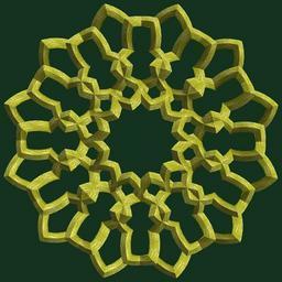 Keywords: mathematica 3d cg parametricplot3d texture torus code program algorithm プログラム コード アルゴリズム 輪環 りんかん ドーナツ どーなつ 六芒星 ろくぼうせい geometric sculpture geometricsculpture shape geometry sculpture mapping テクスチャ マッピング 模様 もよう abstract 抽象 ちゅうしょう アブストラクト design pattern デザイン パターン graphic グラフィック グラフィクス structure 意匠 構造 symmetry 対称性 たいしょうせい シンメトリー 対称 たいしょう black background a = 7; (* center hole size *) b = 6; (* hexa-torus *) c = 10; (* distance from the center of rotation *) d = 12; (* number of torus *) h = 2; (* height of a torus *) SetOptions[ParametricPlot3D, PlotRange -> Full, Mesh -> None, Boxed -> False, Axes -> False, PlotPoints -> 400, ImageSize -> 3000, Background -> RGBColor[{20, 50, 30}/255], PlotStyle -> Directive[Specularity[White, 30], Texture[Import["D:/tmp/71.jpg"]]], TextureCoordinateFunction -> ({#4, #5 Pi} &), Lighting -> "Neutral"]; f[v_] := TriangleWave[{-1, 1}, v/(2 Pi)]; g[v_] := TriangleWave[{-1, 1}, v/(2 Pi) + 1/4]; x = (a - g[t] - f[b s]) Cos[s] + c; y = (a - g[t] - f[b s]) Sin[s] + c; z = (a - f[t] - h f[b s]); rm = Table[{x, y, z}.RotationMatrix[2 i Pi/d, {0, 0, 1}], {i, d}]; ParametricPlot3D[rm, {t, 0, 2 Pi}, {s, 0, Pi}] (*--- The Texture *) a = 7; (* center hole size *) b = 6; (* hexa-torus *) c = 10; (* distance from the center of rotation *) d = 12; (* number of torus *) h = 2; (* height of a torus *) SetOptions[ParametricPlot3D, PlotRange -> Full, Mesh -> None, Boxed -> False, Axes -> False, PlotPoints -> 400, ImageSize -> 3000, Background -> RGBColor[{20, 50, 30}/255], PlotStyle -> Directive[Specularity[White, 30], Texture[Import["D:/tmp/71.jpg"]]], TextureCoordinateFunction -> ({#4, #5 Pi} &), Lighting -> "Neutral"]; f[v_] := TriangleWave[{-1, 1}, v/(2 Pi)]; g[v_] := TriangleWave[{-1, 1}, v/(2 Pi) + 1/4]; x = (a - g[t] - f[b s]) Cos[s] + c; y = (a - g[t] - f[b s]) Sin[s] + c; z = (a - f[t] - h f[b s]); rm = Table[{x, y, z}.RotationMatrix[2 i Pi/d, {0, 0, 1}], {i, d}]; ParametricPlot3D[rm, {t, 0, 2 Pi}, {s, 0, Pi}] (*--- The Texture *) |