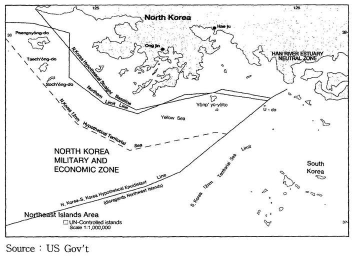 Keywords: 12nm hypothetical Territorial Sea compared with Northern Limit Line, North Korea.jpg en A US Government map showing where a North Korean 12 nautical mile Territorial Waters limit would be when disregarding the north west UN Command islands compared to the UN Command created Northern Limit Line http //118 129 184 33/pub/docu/kr/AM/06/AM062001B01/IMAGE/AM06-2001-B01-0210-01 jpg US Government date Map taken from HTML version of the paper which included this US Government credited map cite journal http //www kmi re kr/data/linksoft/admin/yun_un/up_file/opr161-06 pdf http //118 129 184 33/pub/docu/kr/AM/06/AM062001B01/AM06-2001-B01-006 HTM http //www kmi re kr/paper/oceanpolicy_view asp pub_idx 7093 pub_paper_idx 13792 Seong-Geol Hong Sun-Pyo Kim Hyung-Ki Lee 2001-06-30 Fisheries Cooperation and Maritime Delimitation Issues between North Korea and Its Neighboring Countries Ocean Policy Research 16 1 191-216 Korea Maritime Institute 2010-11-28 HTML version of paper http //118 129 184 33/pub/docu/kr/AM/06/AM062001B01/AM06-2001-B01-006 HTM According to a Korean Central News Agency article Northern Limit Line rejected of 2 August 2002http //www kcna co jp/item/2002/200208/news08/02 htm 14 the U S government distributed this map to the participants in the UN conference on maritime law held in the U S in 1980 The map is also published in a paper by John Barry Kotch and Michael Abbey in http //www asianperspective org/articles/v27n2-f pdf Asian Perspective Vol 27 No 2 2003 pp 175-204 The CIA report The West Coast Korean Islands BGI RP 74-9 January 1974 Declassified 2000-04-18 as CIA-RDP-84-00825R000300120001-7 http //www kpajournal com/declassified-documents-old/The 20West 20Coast 20Islands 20January 201974 pdf describes this or a very similar map However the map itself is redacted from the declassified version of the report PD-USGov Maps of Korea Yellow Sea |