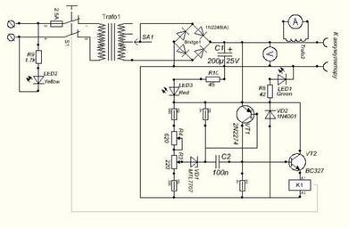 Keywords: 12V charger.JPG de fehlerhaftes Schaltbild eines 12-Volt Akkuladegeräts mit automatischer Abschaltung bei erreichen der Ladespannung LED3 immer in Sperrichtung offenbar falsch gepolt mit Netzwechselspannung betriebene LED2 ohne Antiparallel-Diode und Vorwiderstand wahrscheinlich ungenügend spannungsfest VD2 schützt VT2 nicht en Incorrect 12V charger wiring with automatic switch-off when reaching charging voltage LED3 always in inverse direction obviously wrong polarity Mains AC powered LED2 with no anti-parallel diode the one in-line resistor probably with insufficient dielectric strength VD2 will not protect VT2 ru Схема за ядного уст ойства для 12-вольтовых АКБ et 12V akulaadja own Dmitry G 2008-12-06 Battery chargers Incorrect circuit diagrams |