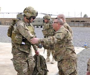 Keywords: 130227-A-DU849-004 (8515534509).jpg U S Army Command Sgt Maj Russel Reimers right the senior enlisted adviser to the commander of the 1st Stryker Brigade Combat Team 1st Armored Division greets Sgt 1st Class Leroy Petry a Medal of Honor recipient who was participating in Operation Proper Exit at Camp Nathan Smith in Kandahar province Afghanistan Feb 27 2013 Operation Proper Exit was an initiative of the Troops First Foundation and the USO that allowed injured veterans to bring closure to their service DoD photo by Sgt 1st Class Joseph Wilbanks U S Army/Released https //www flickr com/photos/39955793 N07/8515534509/ 130227-A-DU849-004 2013-02-27 11 07 https //www flickr com/people/39955793 N07 U S Department of Defense Current Photos PD-USGov U S Department of Defense Current Photos https //flickr com/photos/39955793 N07/8515534509 2016-09-03 09 16 41 United States Government Work Camp Nathan Smith Kandahar United States Department of Defense |