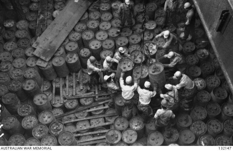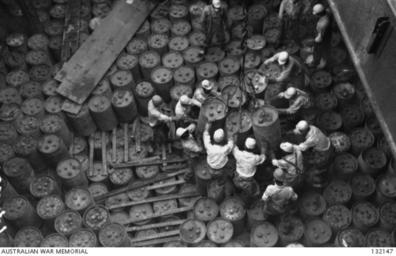 Keywords: 132147 FORMER TADANOUMI BRANCH, ARE BEING STOWED BY JAPANESE WORKEN IN THE HOLD OF THE SHIP SHINTONMARU.JPG en OKUNOSHIMA JAPAN FORMER TADANOUMI BRANCH TOKYO 2ND ARMY CONTAINERS CONTAINING VESICANTS FROM THE ARSENAL ARE BEING STOWED BY JAPANESE WORKEN IN THE HOLD OF THE SHIP SHINTONMARU BECAUSE OF THE DANGEROUS NATURE OF THIS JOB JAPANESE WORKMEN WEAR PROTECTIVE CLOTHING THE CONTAINERS WILL BE DESTROYED LATER AT SEA DURING THE FINAL PHASES OF OPERATION LEWISITE UNDER THE SUPERVISION OF DIRECTOR OF ENGINEERING EQUIPMENT BCOF 132147 Queale Alan 1946-10-03 Copyright expired - public domain PD-AustraliaGov Chemical weapons in Okunoshima 1946-1947 British Commonwealth Occupation Force |
