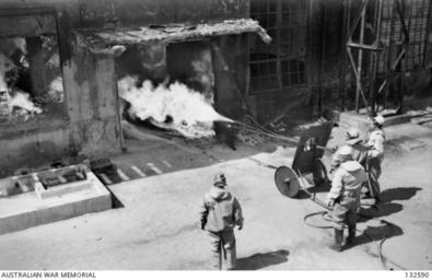 | Keywords: 132590 JAPANESE WORKMEN WEARING GAS-MASKS DIRECTED JETS FROM A MOBILE FLAME-THROWER AND WITHIN A MATTER OF SECONDS THE INTERIOR OF THE BUILDING WAS A RAGING INFERNO.JPG en OKUNOSHIMA JAPAN JAPANESE WORKMEN WEARING GAS-MASKS DIRECTED JETS FROM A MOBILE FLAME-THROWER AND WITHIN A MATTER OF SECONDS THE INTERIOR OF THE BUILDING WAS A RAGING INFERNO THE MUSTARD GAS PLANT FRENCH PATT OF THE TOKYO 2ND ARMY ARSENAL SITUATED ON OKUNOSHIMA ISLAND OF THE INLAND SEA WAS BEING DECONTAMINATED BY FIRE THE DESTRUCTION OF THE POISON GAS ON THE ISLAND WAS COMPLETED SEVERAL MONTHS AGO PRIOR TO BURNING THE INTERIOR OF THE LARGE CONCRETE AND BRICK BUILDING WAS STACKED WITH PILES OF GASOLINE-SOAKED DEBRIS THE WORK OF DECONTAMINATION WAS CARRIED OUT BY THE TEIKOKU RAYON COMPANY UNDER CONTRACT FROM THE JAPANESE GOVERNMENT AND UNDER SUPERVISION OF THE DISPOSAL ENEMY EQUIPMENT SECTION BCOF DEE SEC 132590 Queale Alan 1947-03-20 Copyright expired - public domain PD-AustraliaGov Chemical weapons in Okunoshima 1946-1947 British Commonwealth Occupation Force |