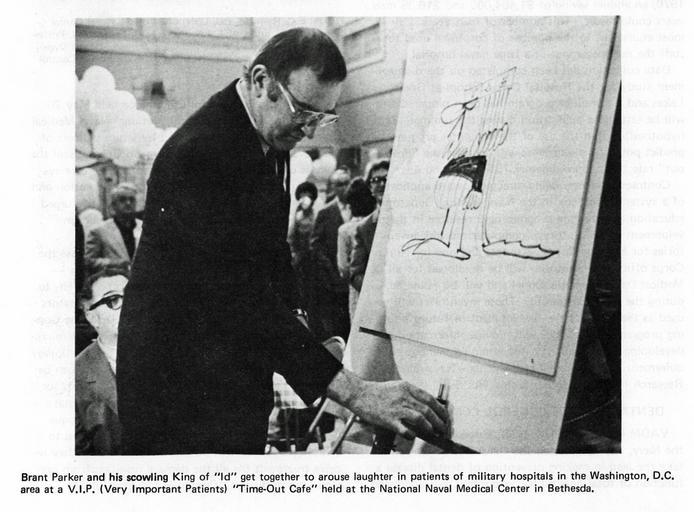 Keywords: blackandwhite monochrome people black and white Brant Parker and his scowling King of "Id" get together to arouse laughter in patients of military hospitals in the Washington, D.C. area at a V.I.P. (Very Important Patients) "Time-Out Cafe" held at the National Naval Medical Center in Bethesda. [cartoon; comic strip; Wizard of Id]. 13-0108, scanned from Navy Medicine magazine, July 1971. Brant Parker and his scowling King of "Id" get together to arouse laughter in patients of military hospitals in the Washington, D.C. area at a V.I.P. (Very Important Patients) "Time-Out Cafe" held at the National Naval Medical Center in Bethesda. [cartoon; comic strip; Wizard of Id]. 13-0108, scanned from Navy Medicine magazine, July 1971. |