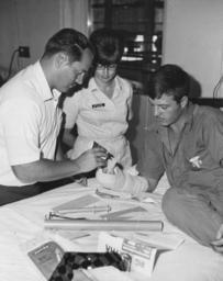 Keywords: blackandwhite monochrome indoor black and white 13-0150 Darryl Angel of the Balsa Busters Rocket Club assists PFC Randy Brown in building a rocket named Big Bertha, while Miss Karen Lund, Recreation Supervisor for the American Red Cross looks on. U.S. Naval Hospital Guam, 22 May 1970. [Vietnam War] Photo by Thomas Edward Walsh, Jr. Navy Medicine Historical Files Collection - Facilities -Guam 13-0150 Darryl Angel of the Balsa Busters Rocket Club assists PFC Randy Brown in building a rocket named Big Bertha, while Miss Karen Lund, Recreation Supervisor for the American Red Cross looks on. U.S. Naval Hospital Guam, 22 May 1970. [Vietnam War] Photo by Thomas Edward Walsh, Jr. Navy Medicine Historical Files Collection - Facilities -Guam