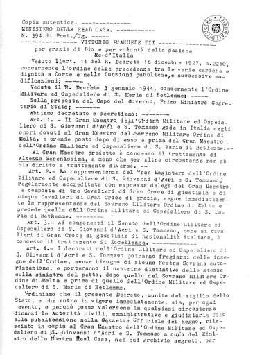 | Keywords: 13 - архивная копия Декрета Короля Виктора Эммануила III (18 января 1944 г.).jpg А хивная копия Дек ета о п изнании о денов Дома Амо озо д' А агона Ко оля Италии Викто а Эммануила III от 30 октяб я 1943 г с печатью а хива т ибунала Судебный а хив г Вико дел Га гано 30 октяб я 1943 г Ко оль Италии Викто Эммануил III Order of Our Lady of Bethlehem PD-Old | ||||