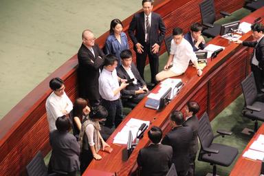 Keywords: 香港本土議員宣誓風波上演政治對決大戲 13.jpg zh-tw 香港立法 10 26日上演驚人政治大戲(美 之音海彥拍 ) 親中建制派上 三製 立法 流 阻止 年新政梁頌恆和遊蕙禎再次宣誓,並政治施壓 迫立法 主席梁君彥改變自己先前裁定,宣布押後兩人宣誓後,10 26日的立法 大 成為外界 注的焦點 同聲譴責梁君彥讓政治凌駕法律的 建制派議員, 三上午組成人鏈,成功護 梁頌恆和遊蕙禎 入議事大廳要求宣誓,但 終梁君彥以無法恢復 議廳秩序為由宣布休 ,再次阻止兩人宣誓 2016-10-26 11 32 46 http //www voachinese com/a/localist-legislators-fail-to-swear-20161026/3566630 html 海彥 other versions Custom license marker 2016 11 06 PD-USGov-VOA Hong Kong LegCo members' oath-taking controversy |