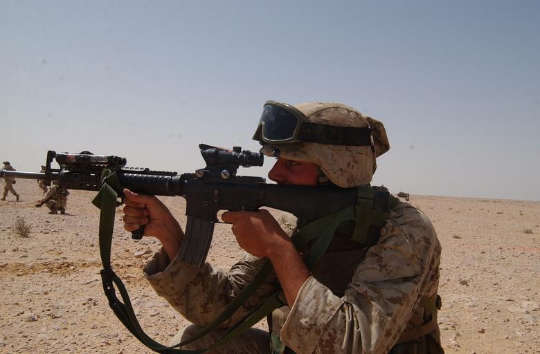 | Keywords: 13th Marine Expeditionary Unit DVIDS10288.jpg en U S Marine Pfc Harrison Majszak a rifleman with Battalion Landing Team 2nd Battalion 1st Marines Echo Company attached to the 13th Marine Expeditionary Unit Special Operations Capable fires his M-16A4 assault rifle at targets during a live-fire training range as part of Exercise Bright Star Sept 20 The exercise is designed to enhance the interoperability and cohesiveness of coalition forces through various training scenarios to include amphibious and combined-arms operations The six-week exercise affords U S service members the opportunity to build awareness and relationships with the host nation of Egypt and fellow coalition forces The 13th MEU is currently on a Western Pacific deployment in support of the Global War on Terrorism Official Marine Corps Photo by Cpl Chad H Leddy released 2005-09-26 https //www dvidshub net/image/10288 10288 2005-09-26 19 06 PD-USGov 13th Marine Expeditionary Unit Images from DoD uploaded by Fæ 2nd Battalion 1st Marines M16 rifle with foregrip |