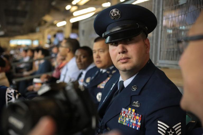 Keywords: u.s. air force usairforce united states air force unitedstatesairforce usaf air national guard airnationalguard ang new york newyork bronx air force airforce afbday air force birthday airforcebirthday celebration ny yankee stadium yankeestadium yankees major league baseball majorleaguebaseball mlb birthday 67th air force 67th airforce67th anniversary airmen airman singing air force band airforceband national anthem nationalanthem color guard colorguard honor guard honorguard flag colors flyover stadium military photo acc usa creative commons royalty free public domain photograph digital matt hecht getty reuters ap people U.S. Air Force Tech. Sgt. Richard Vasquez and other Airmen sit in the stands at Yankee Stadium in Bronx, N.Y. on Sept. 18, 2014. The Yankees hosted Airmen for the singing of the National Anthem, Color Guard presentation, and F-16C Fighting Falcon flyover in honor of the U.S. Air Force 67th birthday. (U.S. Air National Guard photo by Tech. Sgt. Matt Hecht/Released) U.S. Air Force Tech. Sgt. Richard Vasquez and other Airmen sit in the stands at Yankee Stadium in Bronx, N.Y. on Sept. 18, 2014. The Yankees hosted Airmen for the singing of the National Anthem, Color Guard presentation, and F-16C Fighting Falcon flyover in honor of the U.S. Air Force 67th birthday. (U.S. Air National Guard photo by Tech. Sgt. Matt Hecht/Released)