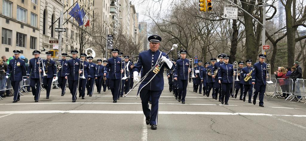 | Keywords: air force usaf ang national guard ngb buehrer eu280 z instrumentalist musician band northeast new york city st. st patrick’s day parade airmen million spectators fifth avenue community relations comrel march play instrument celebration irish northcom nyc peoria il usa outdoor people U.S. Air Force Senior Master Sgt. John E. Christ, drum major with the 553rd Air Force Band, leads the Air National Guard Band of the Northeast during a performance in the New York City St. Patrick's Day Parade in New York March 17, 2015. The band played for spectators along the parade’s Fifth Avenue route as part of its community relations mission. (U.S. Air National Guard photo by Staff Sgt. Lealan Buehrer/Released) U.S. Air Force Senior Master Sgt. John E. Christ, drum major with the 553rd Air Force Band, leads the Air National Guard Band of the Northeast during a performance in the New York City St. Patrick's Day Parade in New York March 17, 2015. The band played for spectators along the parade’s Fifth Avenue route as part of its community relations mission. (U.S. Air National Guard photo by Staff Sgt. Lealan Buehrer/Released) |