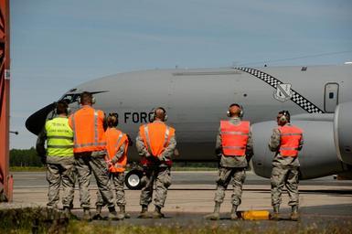 | Keywords: airmen saber strike 15 saberstrike15 air force airforce usaf mf529 latvia service members servicemembers training usafe nato proven partnership provenpartnership forward ready now forwardreadynow military a-10 a10 ceremony saberstrike atlanticresolve allied shield alliedshield friendship st15 army joint multi-national multinational air national guard airnationalguard dv visit dvvisit visit elected representatives electedrepresentatives distinguished visitors distinguishedvisitors aerial-refuling aerialrefuling riga lva outdoor Airmen from the Pennsylvania and Michigan Air National Guard watch a KC-135 Stratotanker carrying the Latvian president elect and distinguished visitors departs for a sortie June 10, 2015, at Riga International Airport, Latvia. U.S. National Guardsmen hosted the Latvian president elect and several distinguished visitors during exercise Saber Strike 15. The visitors were able to view up-close how the Michigan and Pennsylvania Air National Guard conduct aerial-refueling and support ground troops by refueling a Maryland ANG A-10 Thunderbolt II. (U.S. Air Force photo/ Staff Sgt. Armando A. Schwier-Morales) Airmen from the Pennsylvania and Michigan Air National Guard watch a KC-135 Stratotanker carrying the Latvian president elect and distinguished visitors departs for a sortie June 10, 2015, at Riga International Airport, Latvia. U.S. National Guardsmen hosted the Latvian president elect and several distinguished visitors during exercise Saber Strike 15. The visitors were able to view up-close how the Michigan and Pennsylvania Air National Guard conduct aerial-refueling and support ground troops by refueling a Maryland ANG A-10 Thunderbolt II. (U.S. Air Force photo/ Staff Sgt. Armando A. Schwier-Morales) |