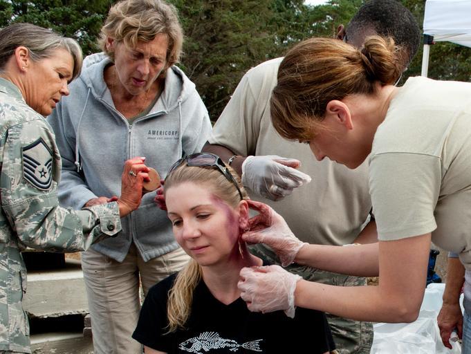 Keywords: 124th fighter wing 124thfighterwing air national guard airnationalguard boise gowen field gowenfield idaho ne514 pathfinder minuteman camp rilea camprilea oregon cascadia subduction zone united states unitedstates people outdoor Master Sgt. Tina Whittington, Staff Sgt. Kelly Goodman, and Senior Master Sgt. Tyrone Clarence of the 124th Medical Group apply simulated injury makeup known as moulage, to victim actors during the Pathfinder Minuteman Exercise, Aug. 5, 2015 at Camp Rilea in Warrenton, Oregon. 124th Medical Group and Chaplains join first responders from six states for Pathfinder Minuteman, an annual two-day emergency response exercise in the aftermath of a simulated Cascadia Subduction Zone earthquake and tsunami. Experts suggest that the Northwest is overdue for a magnitude 7.0 or greater earthquake. (Air National Guard photo by Tech. Sgt. Sarah Pokorney/Released) Master Sgt. Tina Whittington, Staff Sgt. Kelly Goodman, and Senior Master Sgt. Tyrone Clarence of the 124th Medical Group apply simulated injury makeup known as moulage, to victim actors during the Pathfinder Minuteman Exercise, Aug. 5, 2015 at Camp Rilea in Warrenton, Oregon. 124th Medical Group and Chaplains join first responders from six states for Pathfinder Minuteman, an annual two-day emergency response exercise in the aftermath of a simulated Cascadia Subduction Zone earthquake and tsunami. Experts suggest that the Northwest is overdue for a magnitude 7.0 or greater earthquake. (Air National Guard photo by Tech. Sgt. Sarah Pokorney/Released) |