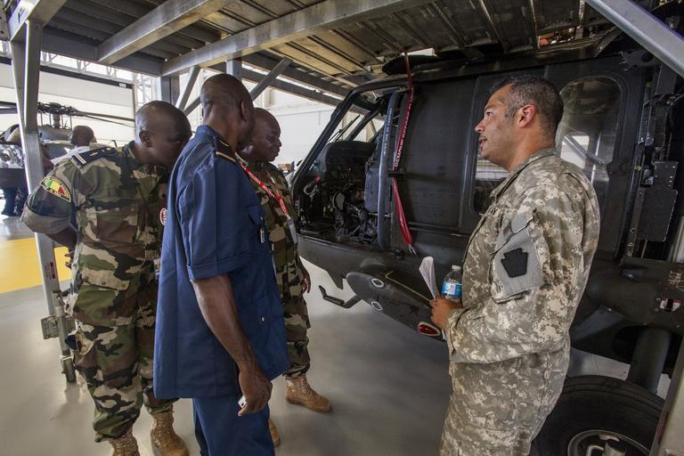 Keywords: african air forces africanairforces african partnership flight africanpartnershipflight africom tour visit conference army aviation support facility armyaviationsupportfacility aasf uh-60a black hawk uh60ablackhawk black hawk blackhawk uh-60a uh60a uh-60 uh60 helicopter helicopters 1-150th assault helicopter battalion 1150thassaulthelicopterbattalion 1-150 ahb 1150ahb new jersey army national guard newjerseyarmynationalguard njarng new jersey national guard newjerseynationalguard njng army national guard armynationalguard arng soldier soldiers aviator aviators crew chief crewchief national guard nationalguard ng u.s. air forces in europe usairforcesineurope usafe u.s. air forces africa usairforcesafrica usafa maintenance logistics knowledge procedures regional military to military events regionalmilitarytomilitaryevents aviation capacity aviationcapacity enhance regional cooperation enhanceregionalcooperation cooperation increase interoperability increaseinteroperability interoperability africa angola burkina faso burkinafaso ghana mali niger nigeria senegal tunisia military united states air force unitedstatesairforce usaf air force airforce af joint base mcguire-dix-lakehurst jointbasemcguiredixlakehurst jbmdl n.j. nj new jersey newjersey aug. 31 2015 aug312015 photo by master sgt. mark c. olsen photobymastersgtmarkcolsen u.s. us Staff Sgt. Simon Debran, right, UH-60A Black Hawk crew chief, briefs visiting African air force members touring the New Jersey Army National Guard’s Army Aviation Support Facility during an AFRICOM conference at Joint Base McGuire-Dix-Lakehurst, N.J., Aug. 31, 2015. The African Partnership Flight visit to the Facility is part of a U.S. Air Forces in Europe and U.S. Air Forces Africa program, which includes military representatives from Angola, Burkina Faso, Ghana, Mali, Niger, Nigeria, Senegal and Tunisia that emphasized increased maintenance and logistics knowledge and procedures. The program was created to conduct regional military to military events with African air forces to build aviation capacity, enhance regional cooperation and increase interoperability. (U.S. Air National Guard photo by Master Sgt. Mark C. Olsen/Released) Staff Sgt. Simon Debran, right, UH-60A Black Hawk crew chief, briefs visiting African air force members touring the New Jersey Army National Guard’s Army Aviation Support Facility during an AFRICOM conference at Joint Base McGuire-Dix-Lakehurst, N.J., Aug. 31, 2015. The African Partnership Flight visit to the Facility is part of a U.S. Air Forces in Europe and U.S. Air Forces Africa program, which includes military representatives from Angola, Burkina Faso, Ghana, Mali, Niger, Nigeria, Senegal and Tunisia that emphasized increased maintenance and logistics knowledge and procedures. The program was created to conduct regional military to military events with African air forces to build aviation capacity, enhance regional cooperation and increase interoperability. (U.S. Air National Guard photo by Master Sgt. Mark C. Olsen/Released)