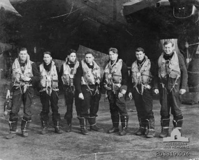 Keywords: 150 Squadron RAF Lancaster aircrew 1945 AWM P03819.004.jpg AWM caption Group portrait of a Lancaster crew of 150 Squadron RAF in front of their aircraft at RAF Station Hemswell <br> Identified left to right 1814561 Flight Sergeant Fl Sgt John Clement Davis RAF VR flight engineer 432681 Fl Sgt Robert Lockyer Masters RAAF wireless operator of Tumut NSW 430174 Fl Sgt Kevin Anthony Kee RAAF navigator of West Brunswick Vic 423161 Flying Officer FO Philip Henry Phil Morris RAAF pilot of Maroubra NSW 419853 Fl Sgt Harvey Bawden RAAF mid upper gunner 435186 Fl Sgt James Noel Griffin RAAF of South Brisbane Qld 433557 James Henry Jim Gillies RAAF bomb aimer of Eastwood NSW While on a raid to bomb the oil refineries of Harpenerweg near Dortmund and Bochum their aircraft Lancaster PB 853 P was hit by anti-aircraft flak and crashed on 24 March 1945 with Fl Sgt Griffin's body found in the wreckage Six crew managed to bail out and land safely four of whom were murdered by German nationals Those murdered were FO Morris Fl Sgts Kee Davis and Masters A War Crimes Group investigated the crimes committed at Bochum and those guilty of the crimes were either sentenced to death by hanging or one to twenty years jail depending on the level of their involvement Fl Sgt Bawden fractured his femur while getting from his turret to the fuselage yet managed to leave the aircraft and land undoubtedly with some discomfort Fl Sgts Bawden and Gillies ended up at the same camp for interrogation and both were subsequently moved to a Luftwaffe fighter station where Bawden was moved to a hospital Bawden received poor medical attention as most staff had disappeared as the station was under sustained attack Flt Sgt Gillies was moved by train and truck through Germany ending up in Fallingbostel POW camp leaving Flt Sgt Bawden to be repatriated some weeks later when the US Army arrived taking him out on his stretcher wired to the bonnet of a jeep P03819 004 circa February 1945 not stated PD-Australia Avro Lancaster aircrew No 150 Squadron RAF RAF Hemswell World War II people of the Royal Australian Air Force ImageNote 1 26 107 51 205 450 362 2 1814561 Flight Sergeant Fl Sgt John Clement Davis RAF VR flight engineer ImageNoteEnd 1 ImageNote 2 91 116 45 189 450 362 2 432681 Fl Sgt Robert Lockyer Masters RAAF wireless operator of Tumut NSW ImageNoteEnd 2 ImageNote 3 352 92 66 231 450 362 2 433557 James Henry Jim Gillies RAAF bomb aimer of Eastwood NSW ImageNoteEnd 3 ImageNote 4 293 106 60 210 450 362 2 435186 Fl Sgt James Noel Griffin RAAF of South Brisbane Qld ImageNoteEnd 4 ImageNote 5 134 112 45 190 450 362 2 430174 Fl Sgt Kevin Anthony Kee RAAF navigator of West Brunswick Vic ImageNoteEnd 5 ImageNote 6 181 115 56 193 450 362 2 423161 Flying Officer FO Philip Henry Phil Morris RAAF pilot of Maroubra NSW ImageNoteEnd 6 ImageNote 7 236 107 59 202 450 362 2 419853 Fl Sgt Harvey Bawden RAAF mid upper gunner ImageNoteEnd 7