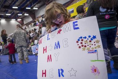 Keywords: joint base elmendorf-richardson jointbaseelmendorfrichardson alaska usa jber ak Ashlynn Deer, 7, waits for her step-father Spc. William Goodwin assigned to the 98th Maintenance Company, 17th Combat Sustainment Support Battalion, U.S. Army Alaska, before a redeployment ceremony to reunite Soldiers with their families at the Buckner Physical Fitness Center, Wednesday, Nov. 4, 2015, on Joint Base Elmendorf-Richardson, Alaska. The "Wolverines" deployed to Southwest Asia for nine months in support of Operation Inherent Resolve, and Operation Enduring Freedom in Afghanistan. (U.S. Air Force photo/Justin Connaher) Ashlynn Deer, 7, waits for her step-father Spc. William Goodwin assigned to the 98th Maintenance Company, 17th Combat Sustainment Support Battalion, U.S. Army Alaska, before a redeployment ceremony to reunite Soldiers with their families at the Buckner Physical Fitness Center, Wednesday, Nov. 4, 2015, on Joint Base Elmendorf-Richardson, Alaska. The "Wolverines" deployed to Southwest Asia for nine months in support of Operation Inherent Resolve, and Operation Enduring Freedom in Afghanistan. (U.S. Air Force photo/Justin Connaher) |