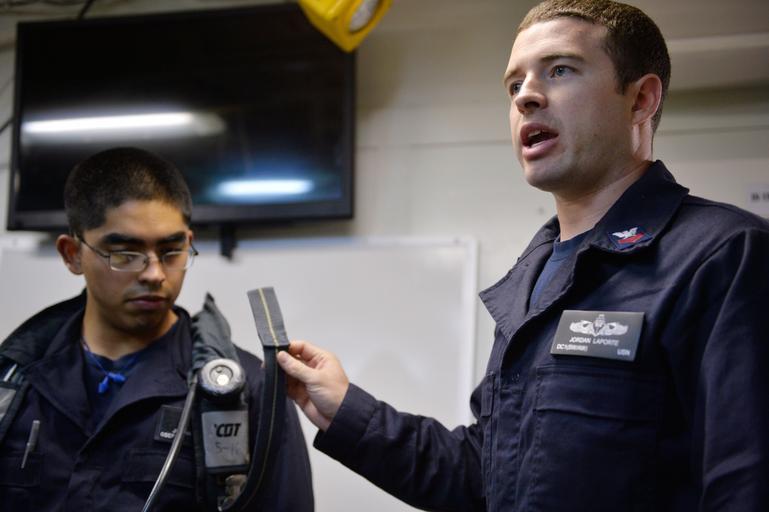 | Keywords: u.s. navy usnavy uss ross (ddg 71) ussrossddg71 groupshot people indoor 151124-N-XT273-035 MEDITERRANEAN SEA (Nov. 24, 2015) Damage Controlman 1st Class Jordan LaPorte demonstrates the proper use of a Self-Contained Breathing Apparatus during egress training aboard USS Ross (DDG 71) Nov. 24, 2015. Ross, an Arleigh Burke-class guided-missile destroyer, forward deployed to Rota, Spain, is conducting naval operations in the U.S. 6th Fleet area of operations in support of U.S. national security interests in Europe. (U.S. Navy photo by Mass Communication Specialist 2nd Class Justin Stumberg/Released) 151124-N-XT273-035 MEDITERRANEAN SEA (Nov. 24, 2015) Damage Controlman 1st Class Jordan LaPorte demonstrates the proper use of a Self-Contained Breathing Apparatus during egress training aboard USS Ross (DDG 71) Nov. 24, 2015. Ross, an Arleigh Burke-class guided-missile destroyer, forward deployed to Rota, Spain, is conducting naval operations in the U.S. 6th Fleet area of operations in support of U.S. national security interests in Europe. (U.S. Navy photo by Mass Communication Specialist 2nd Class Justin Stumberg/Released) |