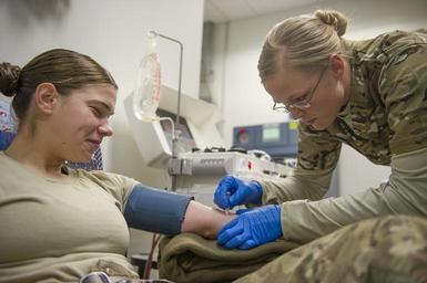 | Keywords: bagram airfield bagramairfield bagram afghanistan freedom's sentinel freedomssentinel army blood platelet donor donation blood bank bloodbank medical laboratory technician medicallaboratorytechnician medical craig joint theater hospital craigjointtheaterhospital af Spc. Lauren O'Neal, 153rd Blood Support Detachment medical laboratory technician, prepares Spc. Samantha Criscio, Guard Force, to give platelets at Craig Joint Theater Hospital on Bagram Air Field, Afghanistan, Dec. 31, 2015. In order to extract platelets, a critical life-saving blood component, apheresis machines are used to draw blood and return the unused portions to the donor. (U.S. Air Force photo/Tech. Sgt. Robert Cloys) Spc. Lauren O'Neal, 153rd Blood Support Detachment medical laboratory technician, prepares Spc. Samantha Criscio, Guard Force, to give platelets at Craig Joint Theater Hospital on Bagram Air Field, Afghanistan, Dec. 31, 2015. In order to extract platelets, a critical life-saving blood component, apheresis machines are used to draw blood and return the unused portions to the donor. (U.S. Air Force photo/Tech. Sgt. Robert Cloys) |