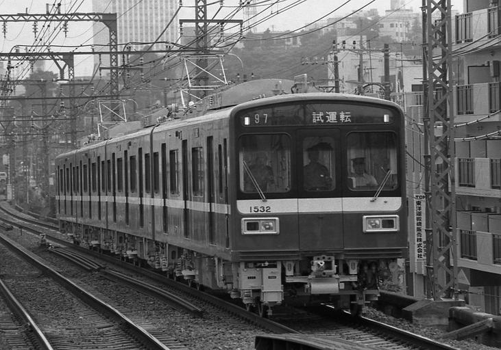 Keywords: 1529 trial run.JPG en Keikyu 1529 trial run at Nakakido station own Hahifuheho 1988-06-25 1988 in rail transport in Japan Black and white photographs of Japan in the 1980s Black and white photographs of trains in Japan Keikyu 1500 series Nakakido Station Number 1532 on vehicles Test run |