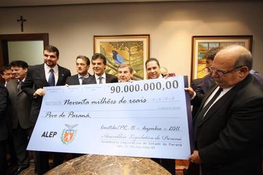Keywords: devolução cheque simbólico chequesimbólico 90 milhões 90milhões economia alep legislativo paranaense legislativoparanaense pedro lupion pedrolupion plauto miró plautomiró beto richa betoricha elio rusch eliorusch gilson de souza gilsondesouza luiz accorsi luizaccorsi groupshot people indoor A Assembleia Legislativa devolveu ao Governo do Estado R$ 90 milhões, resultado das economias pelas medidas moralizadoras e saneadoras implantadas no primeiro ano de gestão da atual Mesa Executiva. O valor foi entregue ao governador Beto Richa (PSDB) no início da tarde desta quinta-feira (15), em ato simbólico realizado na Presidência do Poder Legislativo, na presença de diversos deputados, diretores, além de secretários de Estado. Leia mais: www.alep.pr.gov.br/imprensa/noticias/noticia/20847/assemb... Foto: Nani Gois/Alep (crédito obrigatório) A Assembleia Legislativa devolveu ao Governo do Estado R$ 90 milhões, resultado das economias pelas medidas moralizadoras e saneadoras implantadas no primeiro ano de gestão da atual Mesa Executiva. O valor foi entregue ao governador Beto Richa (PSDB) no início da tarde desta quinta-feira (15), em ato simbólico realizado na Presidência do Poder Legislativo, na presença de diversos deputados, diretores, além de secretários de Estado. Leia mais: www.alep.pr.gov.br/imprensa/noticias/noticia/20847/assemb... Foto: Nani Gois/Alep (crédito obrigatório) |