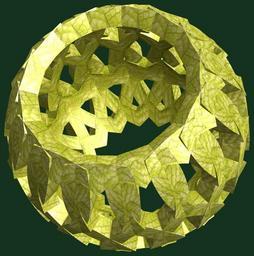 | Keywords: mathematica 3d cg parametricplot3d texture torus code program algorithm プログラム コード アルゴリズム 輪環 りんかん ドーナツ どーなつ 五芒星 ごぼうせい geometric sculpture geometricsculpture shape geometry sculpture mapping テクスチャ マッピング 模様 もよう abstract 抽象 ちゅうしょう アブストラクト design pattern デザイン パターン graphic グラフィック グラフィクス structure 意匠 構造 symmetry 対称性 たいしょうせい シンメトリー 対称 たいしょう plant leaf foliage outdoor organic pattern food a = 6; (* center hole size *) b = 5; (* penta-torus *) c = -12; (* distance from the center of rotation *) d = 15; (* number of torus *) h = 1; (* height of a torus *) SetOptions[ParametricPlot3D, PlotRange -> Full, Mesh -> None, Boxed -> False, Axes -> False, PlotPoints -> 250, ImageSize -> 2400, Background -> RGBColor[{20, 50, 30}/255], PlotStyle -> Directive[Specularity[White, 30], Texture[Import["D:/tmp/71.jpg"]]], TextureCoordinateFunction -> ({#4, #5 Pi} &), Lighting -> "Neutral"]; f[v_] := TriangleWave[{-1, 1}, v/(2 Pi)]; g[v_] := TriangleWave[{-1, 1}, v/(2 Pi) + 1/4]; x = (a - g[t] - f[b s]) Cos[s + 3 Pi/(4 b)]; y = (a - g[t] - f[b s]) Sin[s + 3 Pi/(4 b)]; z = (a - f[t] - h f[b s]) + c; rm = Table[{x, y, z}.RotationMatrix[2 i Pi/d, {1, 1, 0}], {i, d}]; ParametricPlot3D[rm, {t, 0, 2 Pi}, {s, 0, Pi}] (*--- The Texture *) a = 6; (* center hole size *) b = 5; (* penta-torus *) c = -12; (* distance from the center of rotation *) d = 15; (* number of torus *) h = 1; (* height of a torus *) SetOptions[ParametricPlot3D, PlotRange -> Full, Mesh -> None, Boxed -> False, Axes -> False, PlotPoints -> 250, ImageSize -> 2400, Background -> RGBColor[{20, 50, 30}/255], PlotStyle -> Directive[Specularity[White, 30], Texture[Import["D:/tmp/71.jpg"]]], TextureCoordinateFunction -> ({#4, #5 Pi} &), Lighting -> "Neutral"]; f[v_] := TriangleWave[{-1, 1}, v/(2 Pi)]; g[v_] := TriangleWave[{-1, 1}, v/(2 Pi) + 1/4]; x = (a - g[t] - f[b s]) Cos[s + 3 Pi/(4 b)]; y = (a - g[t] - f[b s]) Sin[s + 3 Pi/(4 b)]; z = (a - f[t] - h f[b s]) + c; rm = Table[{x, y, z}.RotationMatrix[2 i Pi/d, {1, 1, 0}], {i, d}]; ParametricPlot3D[rm, {t, 0, 2 Pi}, {s, 0, Pi}] (*--- The Texture *) |