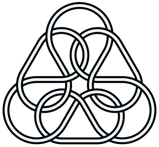 Keywords: 15crossings-three-trefoils-decorative-knot.svg Ornamental knot with three trefoil knots along a closed loop and mutually interlinked For a configuration of four trefoil knots along a closed loop and mutually interlinked see File 20crossings-four-trefoils-decorative-knot svg For a configuration of two trefoil knots along a closed loop and mutually interlinked see http //katlas math toronto edu/wiki/10_120 at the Knot Atlas site Self-made graphic converted from the following Vector PostScript source code <pre> 200 472 translate 65 dup scale/z 20000 sqrt def 11 5 setlinewidth 92 96 1 setrgbcolor/y gsave 28 setlinewidth 0 setgray stroke grestore stroke def/q -35 def/A -280 1881 z add q sub -35 3 q 3 sqrt mul sub 125 209 330 arc z 0 100 150 270 arcn 0 0 100 270 30 arcn 280 1881 q add -35 3 q 3 sqrt mul sub 125 210 331 arc def/B 28 setlinewidth 0 setgray z 0 100 313 285 arcn stroke 0 0 100 52 35 arcn stroke -280 1881 z add q sub -35 3 q 3 sqrt mul sub 125 285 308 arc stroke 11 5 setlinewidth 92 96 1 setrgbcolor z 0 100 314 284 arcn stroke 0 0 100 53 34 arcn stroke -280 1881 z add q sub -35 3 q 3 sqrt mul sub 125 284 309 arc stroke def 1 setlinecap A y 0 setlinecap B gsave 215 234 127 8472 translate 120 rotate A y B grestore gsave -3 102 250 3218 translate -120 rotate A y B grestore 28 setlinewidth 0 setgray z 0 100 94 110 arc stroke 0 0 100 152 170 arc stroke 11 5 setlinewidth 92 96 1 setrgbcolor z 0 100 93 111 arc stroke 0 0 100 151 171 arc stroke gsave 215 234 127 8472 translate 120 rotate 28 setlinewidth 0 setgray z 0 100 94 110 arc stroke 11 5 setlinewidth 92 96 1 setrgbcolor z 0 100 93 111 arc stroke grestore showpage EOF</pre> 15 crossing number knots and links Decorative knots Knots knot theory Images with PostScript source code Knots and links on transparent background Outline knots and links |