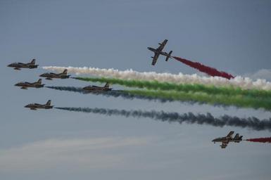 | Keywords: uscentcom usafcent usnavcent usmarcent u.s. marine corps usmarinecorps bahrain international airshow bahraininternationalairshow bahrain u.s. air force usairforce u.s. navy usnavy sakhir airbase sakhirairbase bh outdoor The United Arab Emirates Air Force Al Fursan demonstration team perform at the Bahrain International Airshow at Sakhir Airbase in Manama, Bahrain, Jan. 22, 2016. The Al Fursan planes are painted in black, gold, white, red and green colors and are equipped with smoke generators producing red, green, white and black smoke which are their national flag colors. (U.S. Air Force photo by Staff Sgt. Corey Hook/Released) The United Arab Emirates Air Force Al Fursan demonstration team perform at the Bahrain International Airshow at Sakhir Airbase in Manama, Bahrain, Jan. 22, 2016. The Al Fursan planes are painted in black, gold, white, red and green colors and are equipped with smoke generators producing red, green, white and black smoke which are their national flag colors. (U.S. Air Force photo by Staff Sgt. Corey Hook/Released) |