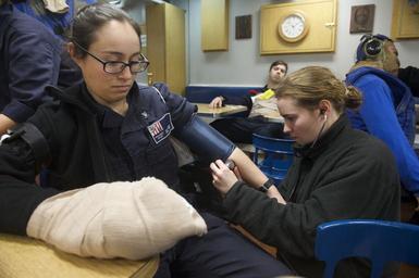 Keywords: navy mediterranean uss carney usscarney ddg 64 ddg64 sixth fleet sixthfleet cne-c6f cnec6f people indoor 160125-N-FP878-132 MEDITERRANEAN SEA (Jan. 25, 2016) Culinary Specialist 2nd Class Kirsti Merritt, from Cleveland, Georgia, checks the vitals of Sonar Technician 3rd Class Amy Palmer, from Midland, Texas, during a mass casualty drill aboard USS Carney (DDG 64) Jan. 25, 2016. Carney, an Arleigh Burke-class guided-missile destroyer, forward deployed to Rota, Spain, is conducting a routine patrol in the U. S. 6th Fleet area of operations in support of U.S. national security interests in Europe. (U.S. Navy photo by Mass Communication Specialist 1st Class Theron J. Godbold/Released) 160125-N-FP878-132 MEDITERRANEAN SEA (Jan. 25, 2016) Culinary Specialist 2nd Class Kirsti Merritt, from Cleveland, Georgia, checks the vitals of Sonar Technician 3rd Class Amy Palmer, from Midland, Texas, during a mass casualty drill aboard USS Carney (DDG 64) Jan. 25, 2016. Carney, an Arleigh Burke-class guided-missile destroyer, forward deployed to Rota, Spain, is conducting a routine patrol in the U. S. 6th Fleet area of operations in support of U.S. national security interests in Europe. (U.S. Navy photo by Mass Communication Specialist 1st Class Theron J. Godbold/Released) |