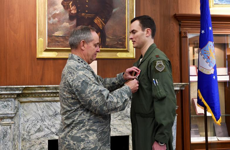 | Keywords: 160201-N-ZD845-094 NEWPORT, R.I. (Feb. 1, 2016) Gen. Mark Welsh III, Air Force chief of staff, pins on the Distinguished Flying Cross to Air Force Maj. Chris Marslender, U.S. Naval War College (NWC) student, during an award ceremony at NWC, Feb. 1. Welsh, who addressed NWC students, faculty and staff earlier in the day, presented Marslender with the award for showing exemplary knowledge and outstanding airmanship under hazardous conditions. (U.S. Navy photo by Daniel S. Marciniak/Released) 160201-N-ZD845-094 NEWPORT, R.I. (Feb. 1, 2016) Gen. Mark Welsh III, Air Force chief of staff, pins on the Distinguished Flying Cross to Air Force Maj. Chris Marslender, U.S. Naval War College (NWC) student, during an award ceremony at NWC, Feb. 1. Welsh, who addressed NWC students, faculty and staff earlier in the day, presented Marslender with the award for showing exemplary knowledge and outstanding airmanship under hazardous conditions. (U.S. Navy photo by Daniel S. Marciniak/Released) |