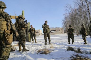 | Keywords: 4th law enforcement battalion 4thlawenforcementbattalion mout military operation on urban terrain militaryoperationonurbanterrain military police militarypolice joint base elmendorf-richardson jointbaseelmendorfrichardson alaska usa us outdoor Marines assigned to Detachment Military Police Company D, 4th Law Enforcement Battalion conduct military operations on urban terrain (MOUT) training at Baumeister City MOUT complex at Joint Base Elmendorf-Richardson, Alaska, March 6, 2016. The training prepared the Marines for their upcoming deployment to Serbia where they will serve as military police advisors. (U.S. Air Force photos/Alejandro Peña) Marines assigned to Detachment Military Police Company D, 4th Law Enforcement Battalion conduct military operations on urban terrain (MOUT) training at Baumeister City MOUT complex at Joint Base Elmendorf-Richardson, Alaska, March 6, 2016. The training prepared the Marines for their upcoming deployment to Serbia where they will serve as military police advisors. (U.S. Air Force photos/Alejandro Peña) |